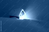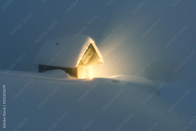 Fantastic winter landscape with wooden house in snowy mountains. Christmas holiday concept