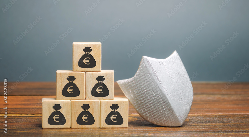 Wooden blocks with money and protection shield. Concept security of money, guaranteed deposits. Client rights protection. Compensation for losses in inflation, safeguarded investment capital.