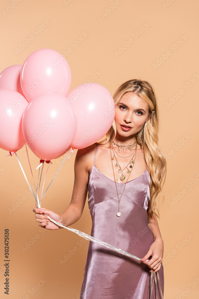 elegant blonde woman in violet satin dress and necklace holding pink balloons on beige