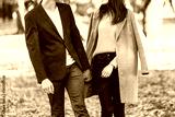 Beautiful young couple walking in autumn park.
