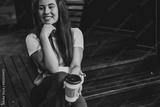 Happy smiling woman drink coffee sitting on wooden steps in street.