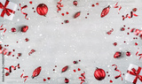 Merry Christmas and New Year background. Xmas holiday card made of flying decorations, fir branches, red balls, snowflakes, sparkles, bokeh, light on wooden background. Selective focus