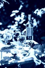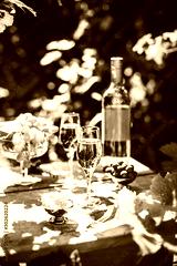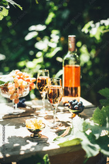 Rose wine tasting, glass of rose wine poured from bottle outdoors in garden party in vineyard, ripe grapes on wooden table, sunlight, harvest time, copy space
