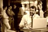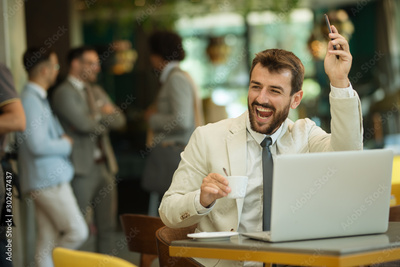 Handsome young businessman working at laptop with cup of coffee in restaurant.