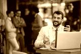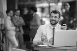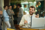 Handsome young businessman working at laptop with cup of coffee in restaurant.