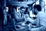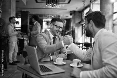Businessmen shaking hands after meeting in a cafe stock