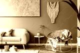 Modern boho interior design of sitting room with design rattan armchair, gray sofa, coffee table, beige macrame, plants and elegant accessories. Stylish home decor. Abstract paintings. Template.