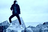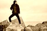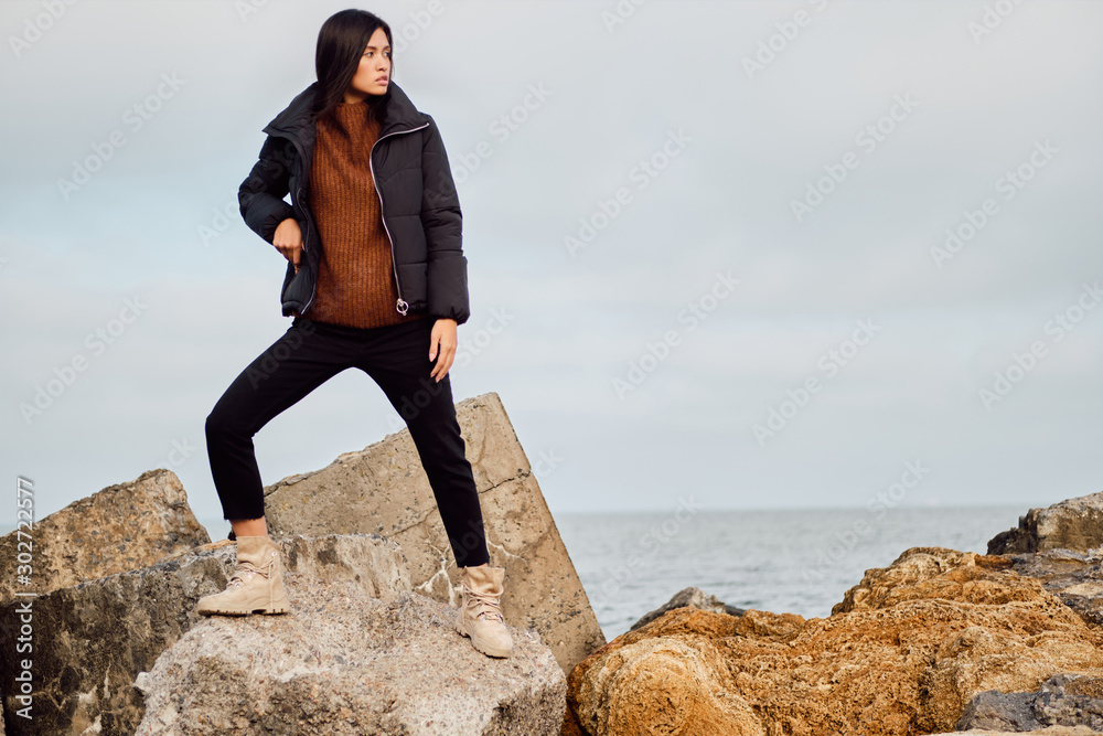 Attractive casual Asian girl in down jacket thoughtfully looking posing away on stones by the sea