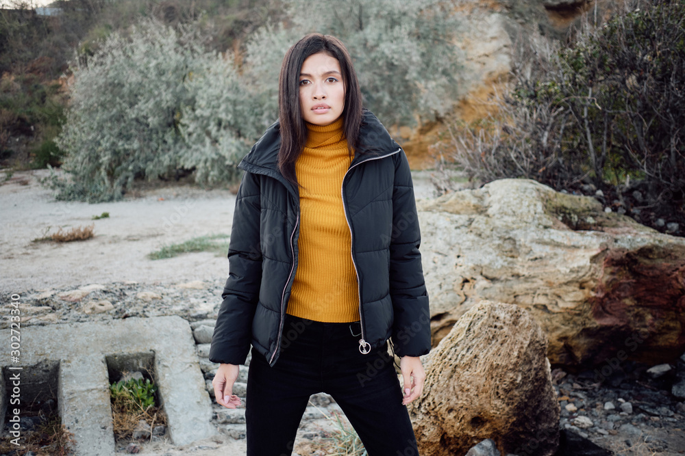 Attractive casual Asian girl in down jacket intently looking in camera outdoor