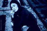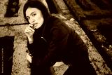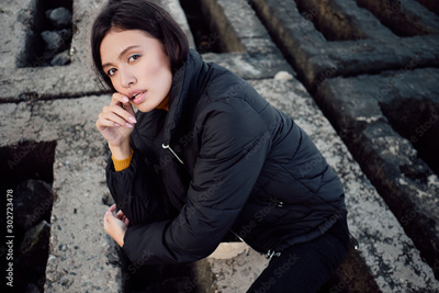 Beautiful stylish Asian girl in down jacket dreamily looking in camera outdoor