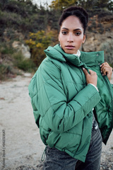 Gorgeous casual African American girl in down jacket confidently looking in camera outdoor