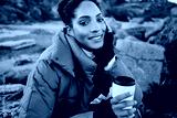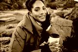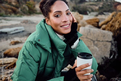 Attractive casual African American girl in down jacket with cup to go happily looking in camera outdoor