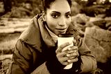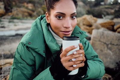 Pretty African American girl in down jacket with cup to go dreamily looking in camera outdoor