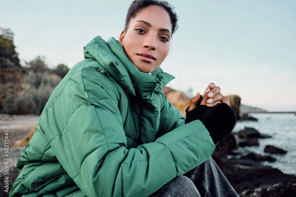 Beautiful casual African American girl in down jacket confidently looking in camera while sitting on stones by the sea