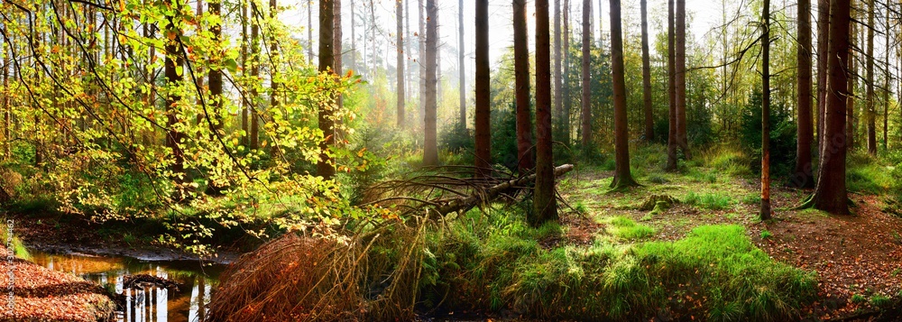 Panorama of an autumnal forest with brook and with bright sunlight shining through the trees