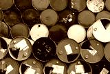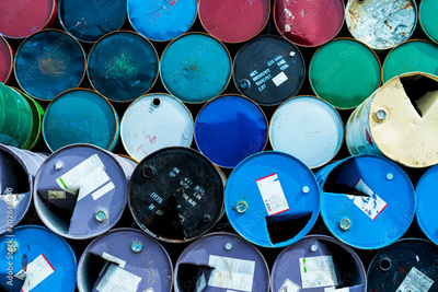 Old chemical barrels. Blue, green, and red oil drum. Steel oil tank. Toxic waste warehouse. Hazard chemical barrel with warning label. Industrial waste in metal drum. Hazard waste storage in factory.