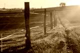 fence posts and wire fence in golden hour sunset light on grass field shot against the sun with selective focus. rural autumn scene in warm sunlight with fence next to agricultural field