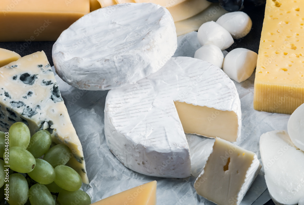 different varieties and types of cheese with fruit, nuts and baguette