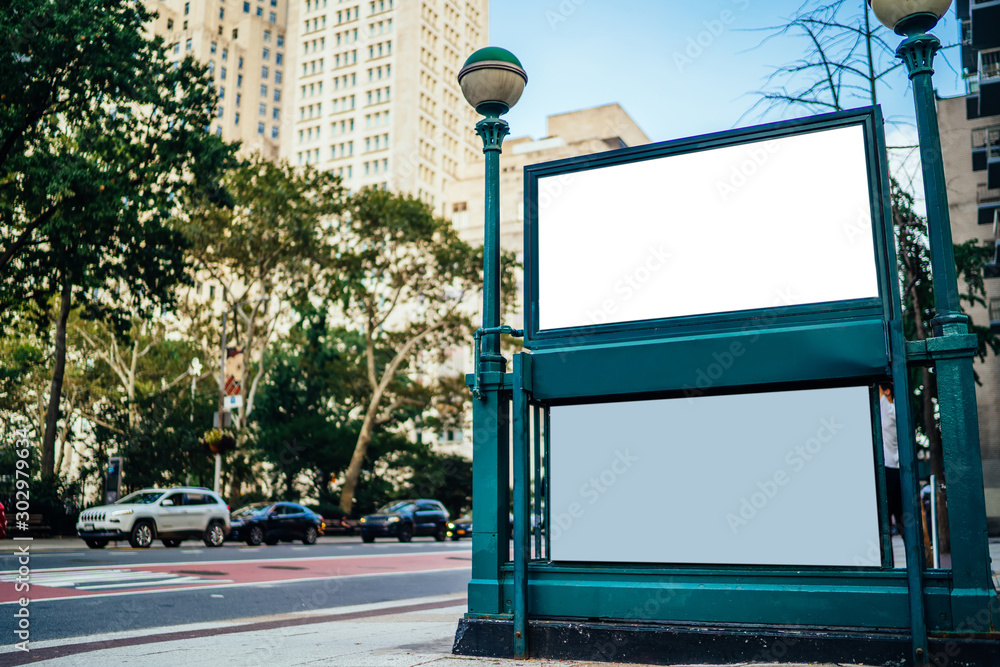 New York City Subway entrance with Clear empty billboard with copy space area for advertising text message or content, public metro transportation information board, promotional mock up on city street