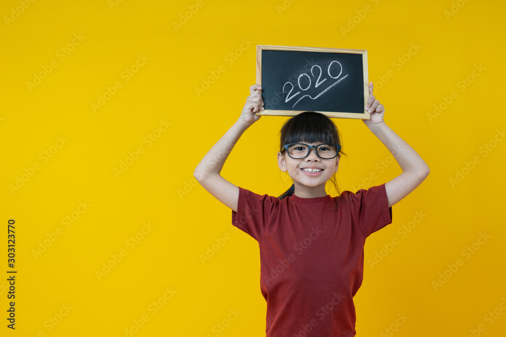 Young Asian Thai girl student holding small blackboard over head with 2020 new years letters, wow and surprised kid concept on yellow bakcground in studio