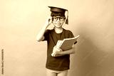 young girl kid student touching glasses and looking camera and wearing degree hat and holding books