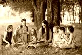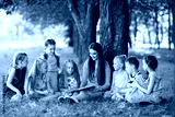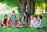 Children and education, young woman at work as educator reading book to boys and girls in park.