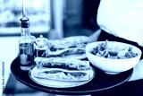 Waiter carrying tray with sandwiches and fresh green salad, cafeteria lunch