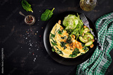 Ketogenic, paleo diet breakfast. Omelette with spinach and avocado, cucumber. Top view, copy space