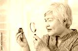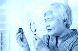 age, medicine, health care and people concept - Doubtful senior woman looking at medicine in his hand with Magnifying glass at home or hospital office