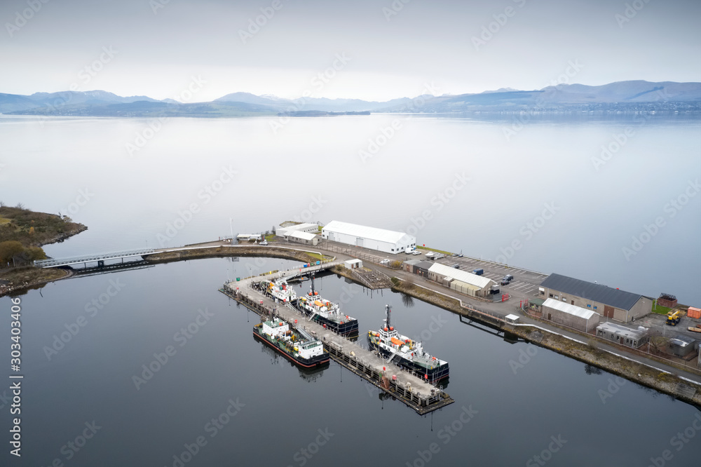 Aerial view of isolated harbour port with ferry ships and grey landscape from above on west coast Scotland near Greenock