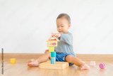 2 years baby boy.Little child boy playing with lots of wooden toys block with mother.Kids play with educational toys at home.Day care and Kindergarten school.child development concept.