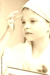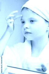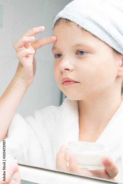 a girl in a white coat and a towel on her head, holds a jar of cream in her hand and puts it on her face