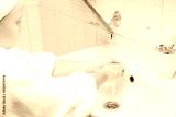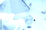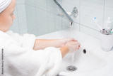 in the bathroom, a girl in a white bathrobe and a towel on her head, washes off soapy hands with tap water