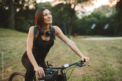 Healthy sporty woman riding her bicycle at park. Portrait woman riding mountain bike in countryside