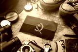Angola Flag Between Traveler's Accessories on Old Vintage Map. Tourist Destination Concept. Tourist Destination Concept.