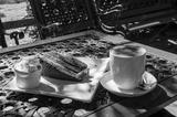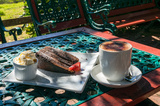 Cuppuccino coffee with chocolate cak, strawberry and vanilla ice cream desset