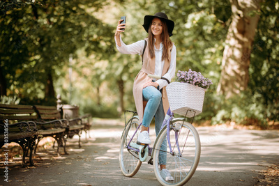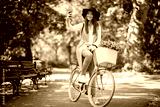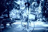 Young beautiful woman riding a bicycle in a park. Active people. Outdoors