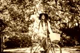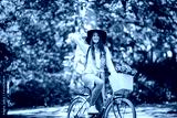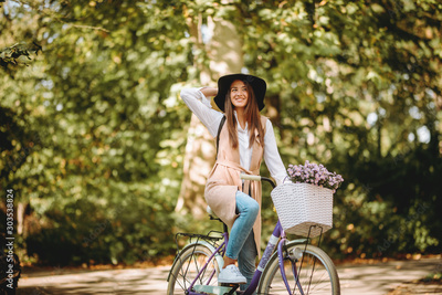 Young beautiful woman riding a bicycle in a park. Active people. Outdoors