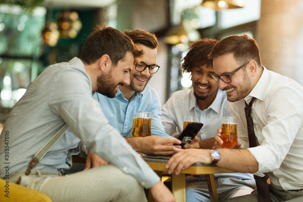 Business people resting in the pub with beer in hands. Having conversation.Funny content on a mobile. Business people resting in the pub with beer in hands. Having conversation.