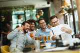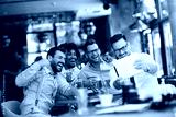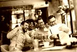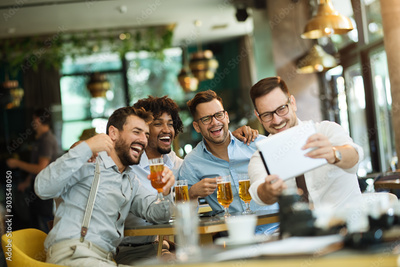 Business people resting in the pub with beer. Having conversation with friends via tablet