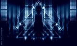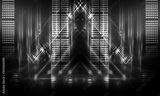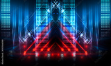 Background of empty show scene. Empty dark modern abstract neon background. Glow of neon lights on an empty stage, diodes, rays and lines. Lights of the night city.