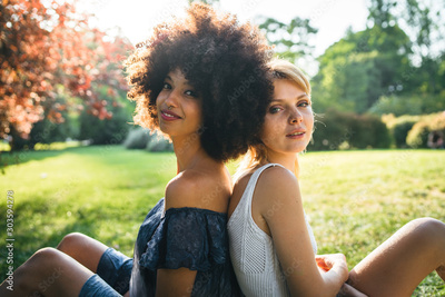 Back light portrait of two young women sitting with their backs against each other in a park at sunset - Millennials are resting on the grass