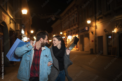 Close up of a young couple shopping in the city at night