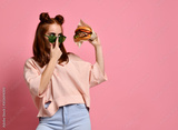 Beautiful teenage girl with red hair holding burger and beverage in hand. Ginger student girl has fast food lunch