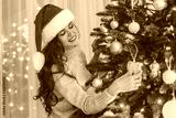 Woman in santa hat decorates Christmas tree in the interior. Christmas and New Year photo.