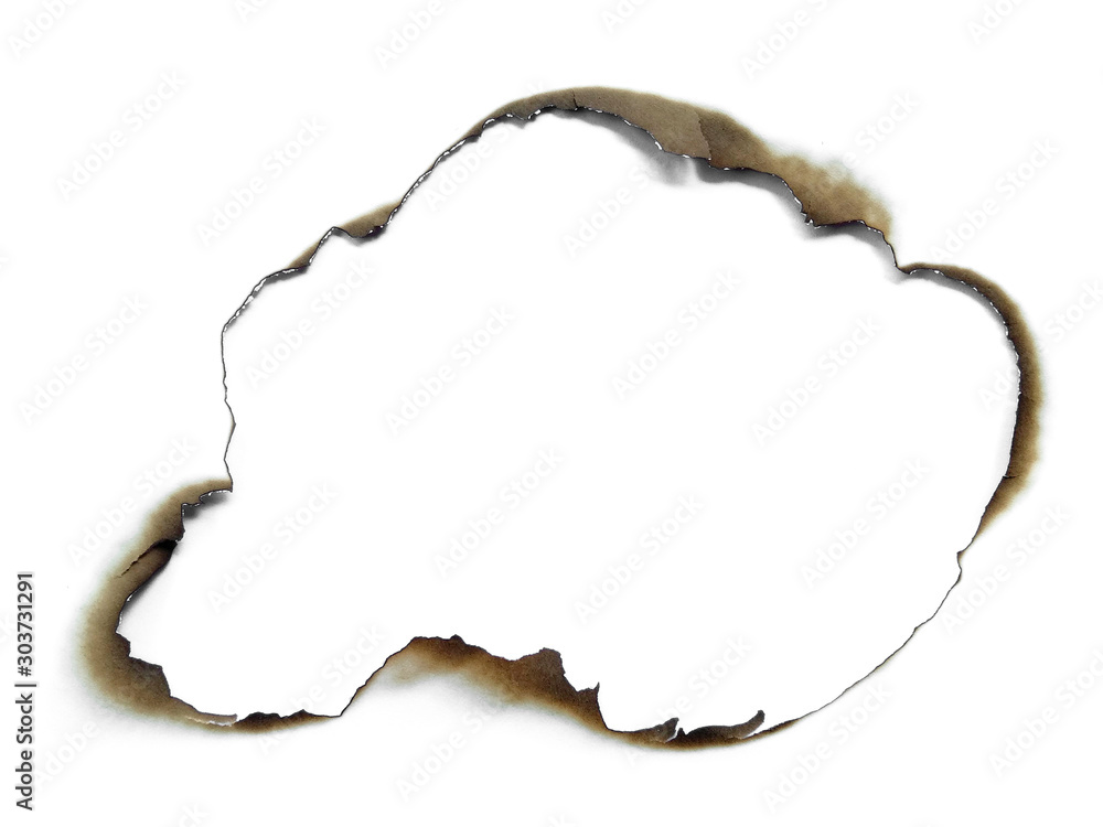 Collection of burnt holes in a piece of paper isolated on white background. Fire holes in white paper.