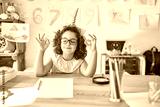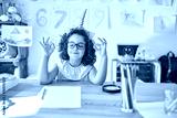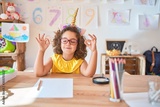 Beautiful toddler wearing glasses and unicorn diadem sitting on desk at kindergarten relax and smiling with eyes closed doing meditation gesture with fingers. Yoga concept.