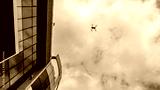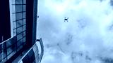 a drone flies close to a building. a drone in the sky above the city. flying drone high in the sky against the backdrop of a beautiful sky with white clouds.