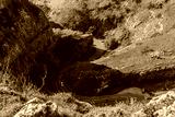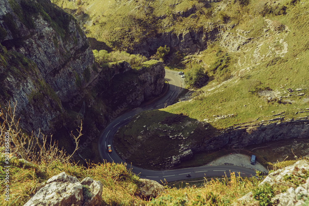 Top view of Road with cars and parking between the stone rocks with green forest. High edge view from mountain. Retro vintage style. Copy space.