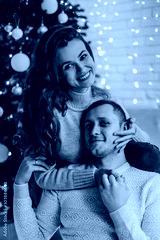 Lovely couple in sweaters hugging and celebrating new year in front of Christmas tree in decorated interior.